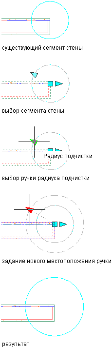 Данная процедура используется для того, чтобы переопределить принятое по умолчанию значение радиуса круга подчистки на одном конце стены. Радиус круга подчистки можно переопределить также на палитре свойств и через контекстное меню выбранной стены.