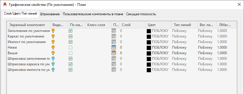 Эта процедура используется для задания свойств одной или нескольких секущих плоскостей для стиля оконной/дверной сборки. Графические свойства секущей плоскости применяются только к таким экранным представлениям, как "План", в которых используется вид сверху.