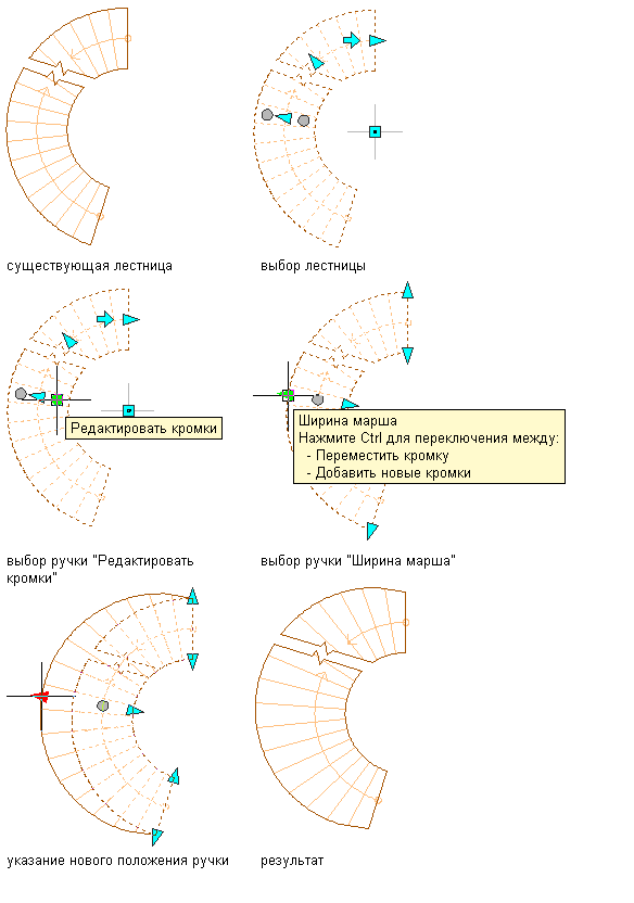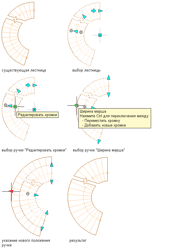 - Если щелкнуть мышкой указатель ручки "Ширина марша" при нажатой клавише CTRL, то местоположение центра лестницы и внешних ручек сохраняется. Это приводит к изменению формы лестницы.