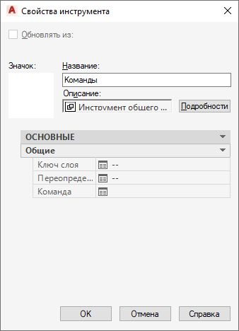 | Изображение | По умолчанию инструменту работы с командами не назначено изображения. Чтобы добавить изображение, иллюстрирующее назначение инструмента, щелкните незаполненную область изображения правой кнопкой мыши и выберите изображение. |