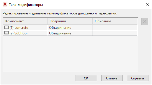 Эта процедура используется для редактирования или удаления 3D тел-модификаторов из перекрытия или ската крыши. Предусмотрена возможность изменения как компонента, к которому применяется тело-модификатор, так и способа применения тела-модификатора (добавление, вычитание или замена). Можно также вводить или редактировать описания тел-модификаторов.