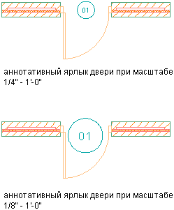 На следующем рисунке показана марка двери, отображающаяся в двух различных масштабах аннотаций. Марка двери создана в чертеже с первым масштабом аннотаций, затем масштаб аннотаций был изменен.