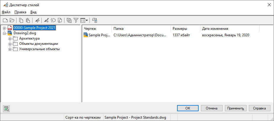 Данная процедура применяется для изменения способа сортировки стилей в Диспетчере стилей. По умолчанию имена открытых чертежей и шаблонов отображаются в виде древа на левой панели. Когда чертеж разворачивается в виде иерархической структуры, отдельные стили чертежа группируются по трем категориям: "Архитектура", "Объекты документации" и "Универсальные объекты". При разворачивании категории отдельные стили выстраиваются в список в алфавитном порядке по типам стилей.