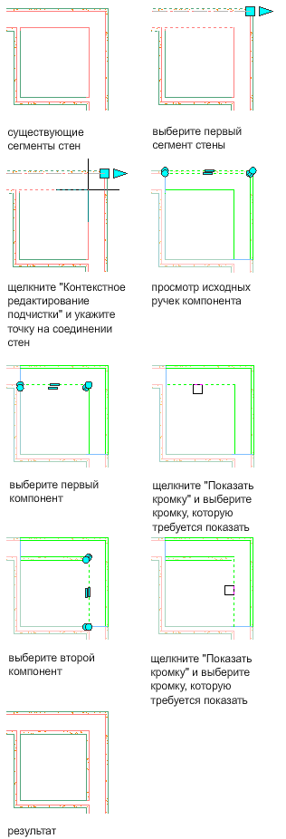Данная процедура применяется для редактирования пересечения стен путем отображения ранее скрытой кромки компонента стены.