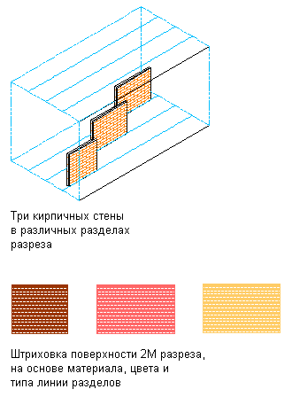 При создании в стиле графических разделов обычно нужны объекты, которые были бы визуально отличимы от объектов других разделов. При назначении материалов объектам можно задать стиль 2D разреза так, чтобы в нем использовался шаблон штриховки из материала, а цвет и тип линии - из экранного компонента раздела.