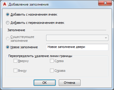 | добавление в качестве "Переопределения для ячейки", и при этом требуется вставить дверь, окно или дверную/оконную сборку стиля, отличного от того, который имеется в текущем чертеже, с удалением кромки каркаса, охватывающего объект, | выберите "Новое заполнение" и введите имя для объекта. Затем в опции "Переопределение удаления границы каркаса" выберите "Сверху", "Снизу", "Слева" или "Справа" и нажмите "ОК". |