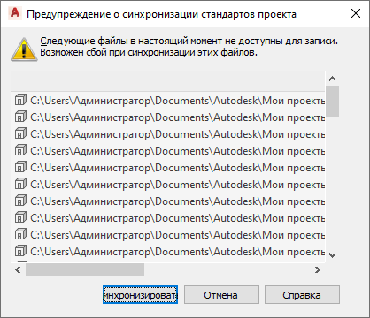 Если имеются чертежи проекта, недоступные для синхронизации, выдается предупредительное сообщение: