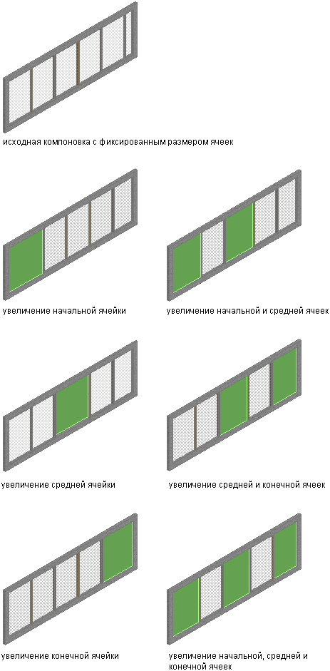 Можно выполнить автоподстройку делений ячеек с помощью задания начальной, средней или конечной ячейки или любой комбинации этих ячеек, соответствующей увеличению ячейки. Размер каждой ячейки зависит от заданной комбинации ячеек. На следующем рисунке показаны все возможные комбинации увеличения ячеек, например, показана оконная/дверная сборка с ячейками, выделенными зеленым цветом.