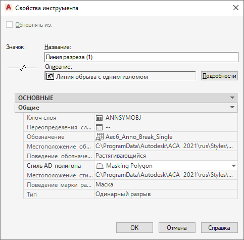 - Инструменты линий обрыва должны содержать поддерживающие элементы, сохраняемые в том же чертеже, что и символ линии обрыва. Это облегчит их последующее редактирование, а также редактирование других многокомпонентных инструментов, таких как марки. Все свойства обозначений разрыва задаются в свойствах инструмента, в том числе, возможность для обозначений разрыва маскировать или обрезать объекты.