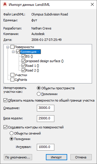 Прим.: Файл LandXML содержит сведения о единицах измерения, используемых в чертеже. При импорте файла LandXML в чертеж с другими единицами измерения данные LandXML конвертируются в единицы измерения в текущем DWG-файле. Если файл LandXML, данные которого представлены в метрах, импортируется в чертеж, на котором размеры заданы в миллиметрах, может оказаться так, что результирующие координаты выйдут за пределы диапазона точных вычислений.