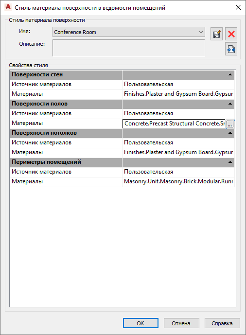 В Roombook имеется набор стандартных стилей материалов поверхности, которые можно загрузить в чертеж. Стили материалов поверхности можно сохранять, копировать, удалять, импортировать или экспортировать.
