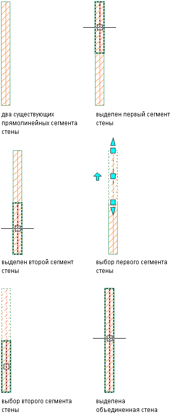 Данная процедура используется для объединения базовых линий двух стен с целью создания единого сегмента стены. Стыкуемые между собой стены должны отвечать следующим условиям: