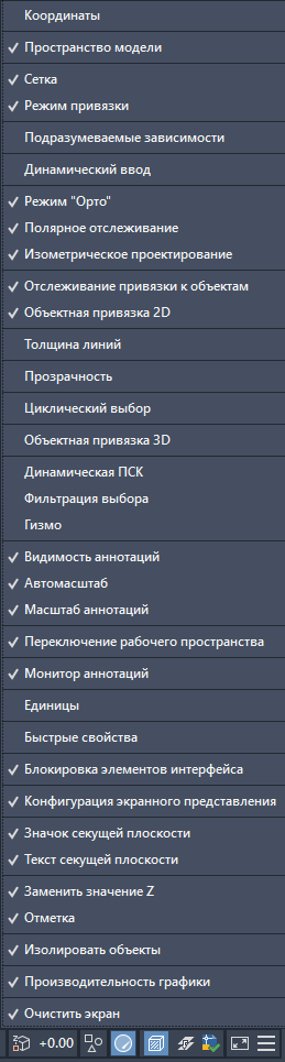 В меню строки состояния можно отображать или скрывать отдельные команды.