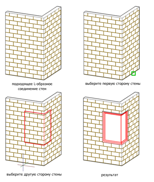 угловое окно в стене, выберите соответствующее L-образное соединение стен. Укажите точку вставки вдоль по второй стене.