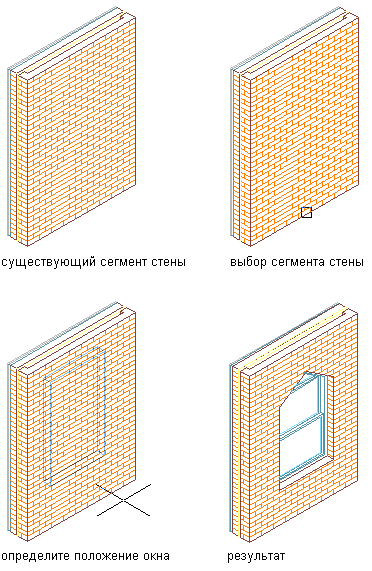 окно в стене, выберите стену и укажите точку вставки вдоль стены.