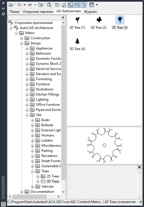 Если пользователь для открытия Центра управления использует раскрывающийся список панели «Палитры» на вкладке «Вид» и переходит на вкладку «AD-библиотека», на панели слева появится дерево «Сторонние приложения», корневым узлом которого является AutoCAD Architecture 2021 toolset. Внутри папок "Британские" и "Метрические" под корневым узлом располагаются папки по категориям, которые в первом приближении соответствуют разделам "Главного формата" (MasterFormat) CSI 2004. На самом низком уровне дерева каждая папка указывает на один или несколько файлов внешних чертежей, в каждом из которых имеется один элемент AD-библиотеки. Для включения и выключения представления в виде дерева используется кнопка