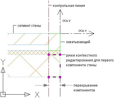Часто приходится работать со стилями стен, имеющими один или несколько компонентов, которые служат как покрытие в местах торцов стен или проемов. Например, компонент стены "кирпич" в некоторых стилях стен покрывает торец стены. При наличии этого условия параллельная оси Y контрольная линия обозначает самую дальнюю внутреннюю грань компонента. Оставшиеся компоненты стиля стены начинаются от этой контрольной линии, начальные ручки отображаются вдоль контрольной линии.