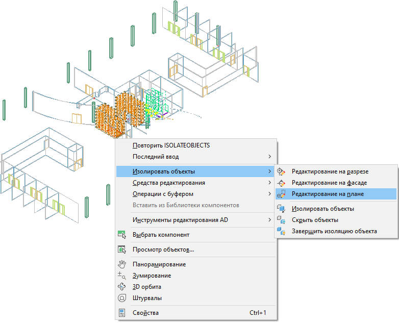 Можно определить набор объектов на чертеже и выполнять их просмотр и редактирование на временном разрезе, фасаде или виде в плане. При редактировании временного вида ПСК будет выровнена по нему.