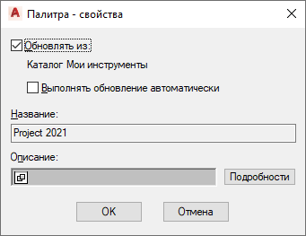 Если установлен флажок "Включить автоматическое обновление", каждый запуск приложения будет сопровождаться обновлением любых связанных инструментальных палитр каталога с учетом любых их изменений или изменений их компонентов.
