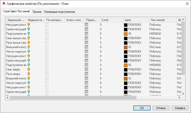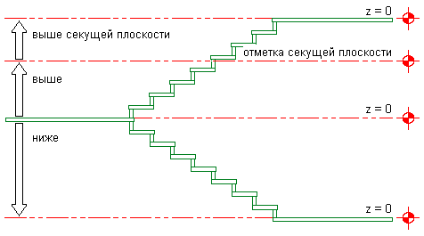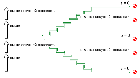 Задание экранных свойств компонентов лестницы в зависимости от их расположения относительно отметки плоскости сечения