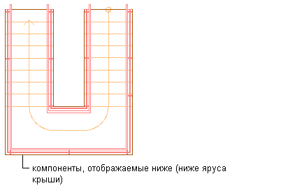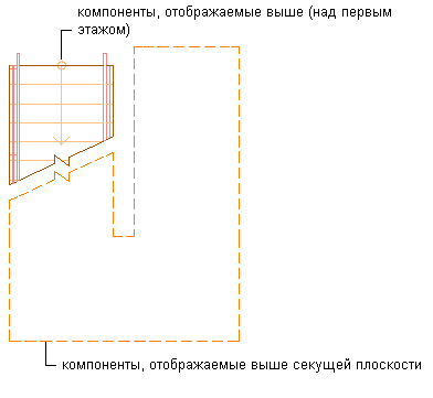 Отображаются как верхние экранные компоненты, расположенные над первым этажом, так и экранные компоненты над плоскостью сечения (обозначены пунктирным контуром).
