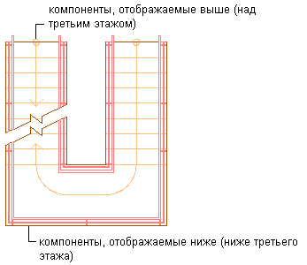 Существуют новые возможности, обеспечивающие поддержку представления компонентов лестницы над отметкой секущей плоскости, и таким образом нижние компоненты лестницы используются только для отображения компонентов, расположенных ниже текущего уровня.