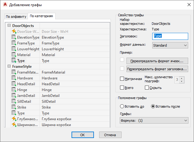 Также до добавления столбцов необходимо указать объекты, к которым относится стиль спецификации.