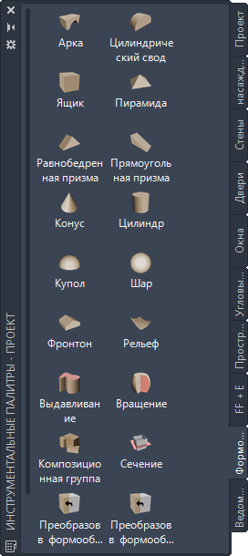 Пользовательские палитры, сформированные администратором САПР или другими пользователями, могут содержать инструменты формообразования со стилями и свойствами формообразующих элементов, адаптированными к конкретным проектам или стандартам организации.