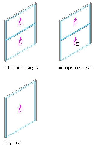 В большинстве случаев объединяют ячейки с одним и тем же типом заполнения. В этом случае объединенная ячейка относится к тому же типу, что и исходные ячейки. Например, при объединении двух ячеек с заполнением сплошными панелями полученная объединенная ячейка также имеет заполнение в виде сплошной панели. Иногда требуется объединить две ячейки с различным типом заполнения. В таком случае для объединенной ячейки используется тип заполнения первой выбранной ячейки. Например, если требуется объединить ячейку с заполнением обычной панелью и ячейку с заполнением окном, при этом первой выбрана ячейка с обычной панелью, объединенная ячейка содержит заполнение обычной панелью, а не окном. Если выбрать две ячейки в обратном порядке, то заполнением объединенной ячейки является не простая панель, а окно.