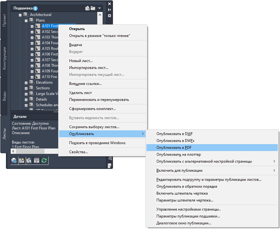 В дереве "Вид подшивки" можно опубликовать листы на плоттер, в файл PDF, DWF или DWFx. Можно назначить для подшивки штемпели чертежей, опубликовать листы с другими параметрами страниц и задать параметры публикации в форматах PDF, DWF и DWFx.