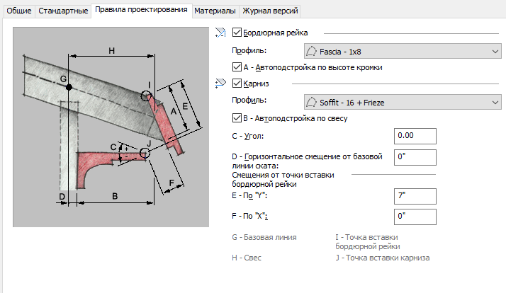 Эта процедура используется для задания бордюрной рейки и карниза для стиля кромок перекрытий/скатов крыш. При этом необходимо наличие в чертеже профилей для бордюрной рейки и карниза.