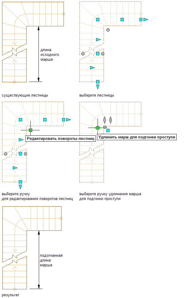 Эта процедура используется для удлинения какого-либо марша в целях совмещения кромки проступи стиля "Одиночная точка" с центром поворота забежной лестницы.