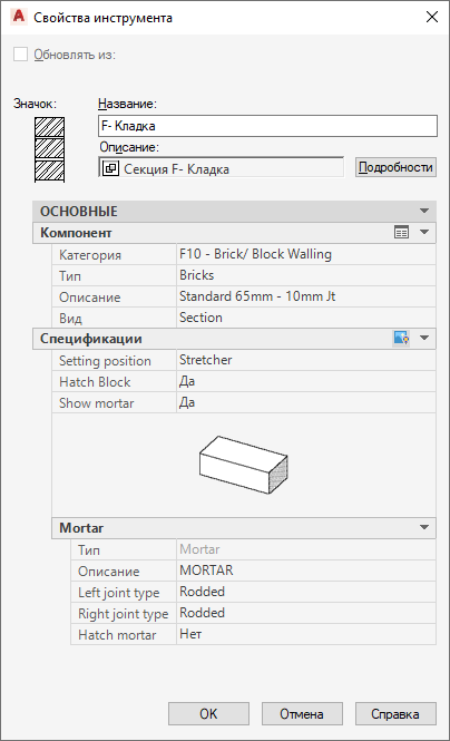 Внешний вид таблицы "Свойства инструмента" меняется в зависимости от типа компонента и текущей конфигурации параметров свойств. На следующем чертеже показаны две конфигурации таблицы "Свойства инструмента" для инструмента "04 - Кладка", входящего в образец базовой палитры инструментов. В обоих случаях инструмент настроен на добавление стандартных соединенных кирпичей размером 3/8 дюйма, но в первой конфигурации для "Вида" установлено значение "В разрезе", тогда как во второй - "Фасад" (по образцу)". Для компонентов деталей, которые в разных видах могут быть сориентированы по-разному, значение свойства "Вид" задает конкретную процедуру выполнения чертежа, используемую для вставки изображения в чертеж. Отметим, что при различных значениях "Вида" отображения ориентации в таблице будут различны. Отметим также, что спецификации раствора не применяются к параметрам вида "Фасад" (по образцу)" и в соответствующей конфигурации не отображаются. Свойства, отображаемые под "Спецификациями", также зависят от других параметров. Например, если параметр "Отобразить свойства раствора" установлен на "Нет", а "Вид" установлен на "В разрезе", то никакие другие свойства раствора не отображаются. К некоторым компонентам деталей "Спецификации" не применимы, и заголовок на экране не появляется.