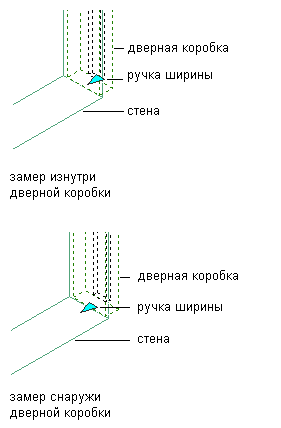 Измерение до...   Определяется, измерена ли толщина и высота двери до внутренней или до наружной стороны дверной коробки. Размер двери, измеренный до наружной стороны коробки, меньше на величину, отведенную на коробку.
