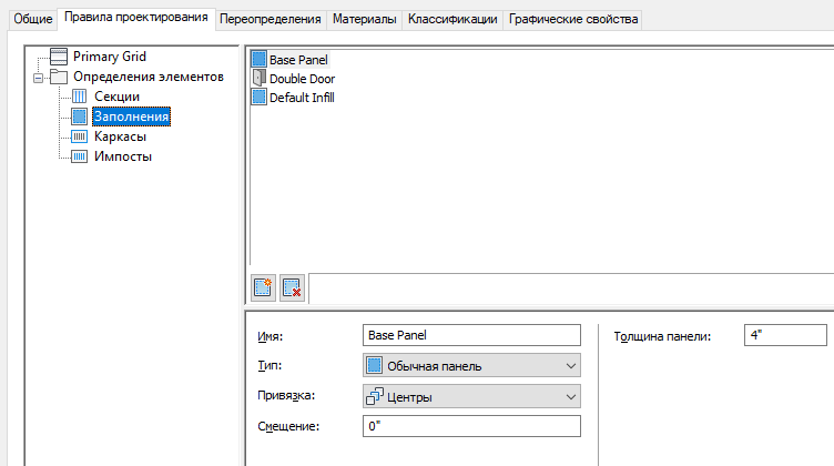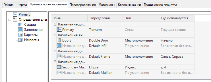 Определения элементов можно отредактировать с помощью вкладки "Правила проектирования" в диалоговом окне "Свойства стиля дверных/оконных сборок". Получить доступ к этим определениям можно из списка назначений и из списка определений.