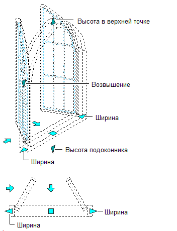 Ручки размеров окна на "Виде сверху" и на "Модели"