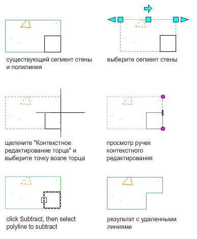 Данная процедура применяется для редактирования торца стены путем вычитания профиля из компонента. Профилем может служить любая площадь внутри полилинии, перекрывающая конкретный компонент.