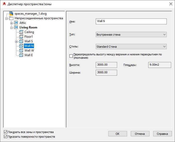 | Высота/площадь (только для выдавленных 3D пространств) | выберите "Переопределить высоту поверхности по умолчанию" и введите новое значение в поле "Высота" или "Площадь". Оба эти поля используются только для изменения высоты пространства. |