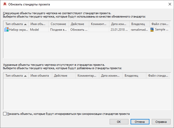 В таком случае элемент не будет отображаться во время последующих обновлений, если не будет установлен флажок "Показать объекты, которые назначено игнорировать во время синхронизации стандартов проекта", или если в Диспетчере экранных представлений для параметра представления будет снят флажок "Игнорировать".