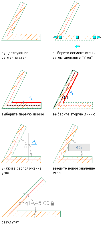 Зависимость "Угол" дает возможность сохранить заданный угол между 2 AD-объектами. Зависимость "Угол" также применима между соответствующими AD-объектами и объектами AutoCAD, например, между сегментом стены и линией.