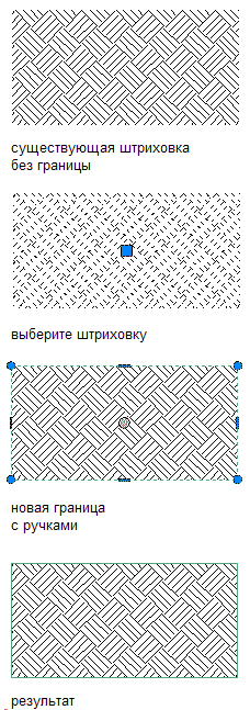 Эта процедура используется для получения контура штриховки, исходный контур которой был удален или перенесен в процессе выполнения других операций с чертежом. Граница, сформированная этой процедурой, является полилинией. Полилинии формируются также для любых замкнутых пространств в пределах выбранной штриховки. Эти полилинии остаются в выборке и после формирования контура, поэтому вы можете непосредственно вставлять их в любую конфигурацию. Далее можно применить штриховку к конфигурации с новым контуром, используя для этого опцию "Задать границу".