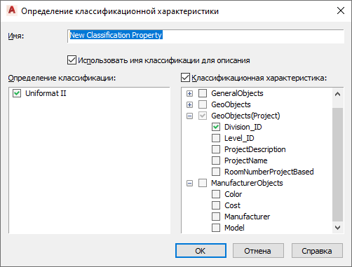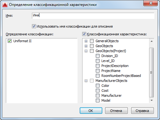 Отображается диалоговое окно "Определение классификационной характеристики". На панели слева перечислены определения классификации, которые относятся к стилю объекта для текущего определения набора характеристик. Например, если текущее определение набора характеристик применяется к стилям дверей, в панели "Классификация" перечислены все описания классификаций, применимых к стилям дверей.