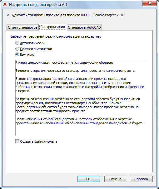 Прим.: Задаваемые настройки синхронизации относятся только к синхронизации стилей и графических параметров AD-стандартов в проекте. Они не влияют на синхронизацию стандартов AutoCAD в проекте. Настройки в диалоговом окне относятся к управлению процессом синхронизации чертежей проекта с чертежами стандартов проекта. Они не определяют порядок синхронизации чертежей стандартов проекта друг с другом.