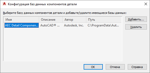Выбранная база данных будет добавлена внизу списка в диалоговом окне "Конфигурация баз данных компонентов деталей".