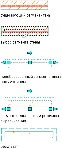 Данная процедура служит для изменения одной или нескольких стен путем изменения свойств инструмента стены. К свойствам относятся стиль стен и все остальные параметры, заданные в выбранном инструменте.