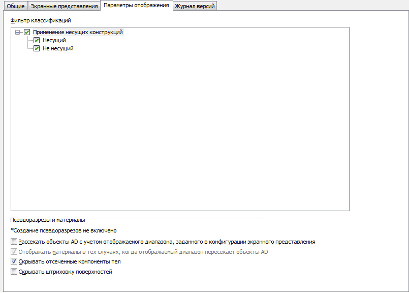 использовать диапазон отображения конфигурации ЭП для определения вертикальных границ вида псевдоразреза, выберите "Рассекать AD-объекты с учетом диапазона из экранной конфигурации". Если требуется графически указать, насколько объекты модели простираются ниже диапазона отображения, выберите "Показывать материалы при рассечении AD-объектов в диапазоне".