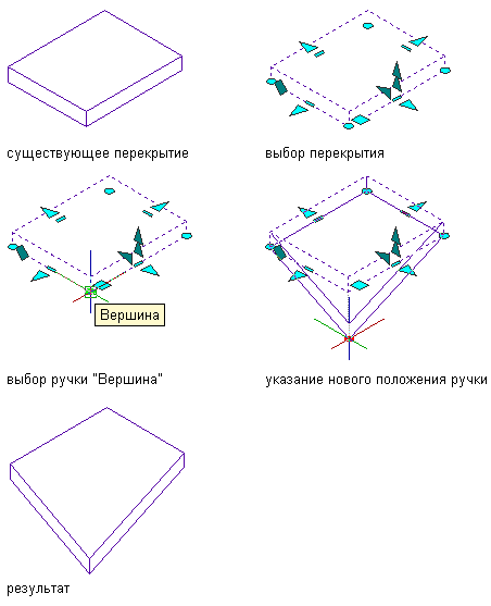 Эта процедура используется для изменения размера или формы перекрытия/ската крыши посредством перемещения одной или нескольких вершин объекта.