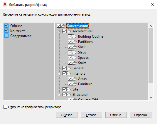 | выбрать целую категорию для внесения ее в чертеж "Вид", | выберите категорию. Все конструкции этой категории будут выбраны автоматически. Если позднее к категории будут добавлены новые конструкции, они будут внесены в чертеж "Вид". |
