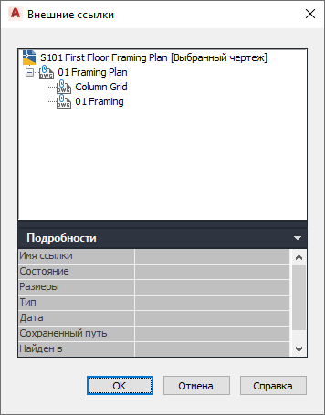 Прим.: Кроме того, внешние ссылки можно отобразить, открыв чертеж с листами и воспользовавшись Диспетчером внешних ссылок AutoCAD.