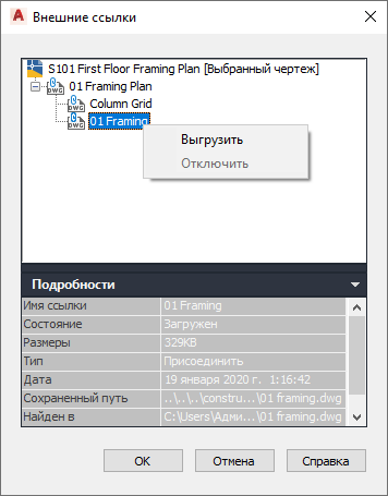 Из контекстного меню можно выгрузить, повторно загрузить или удалить присоединенную внешнюю ссылку.